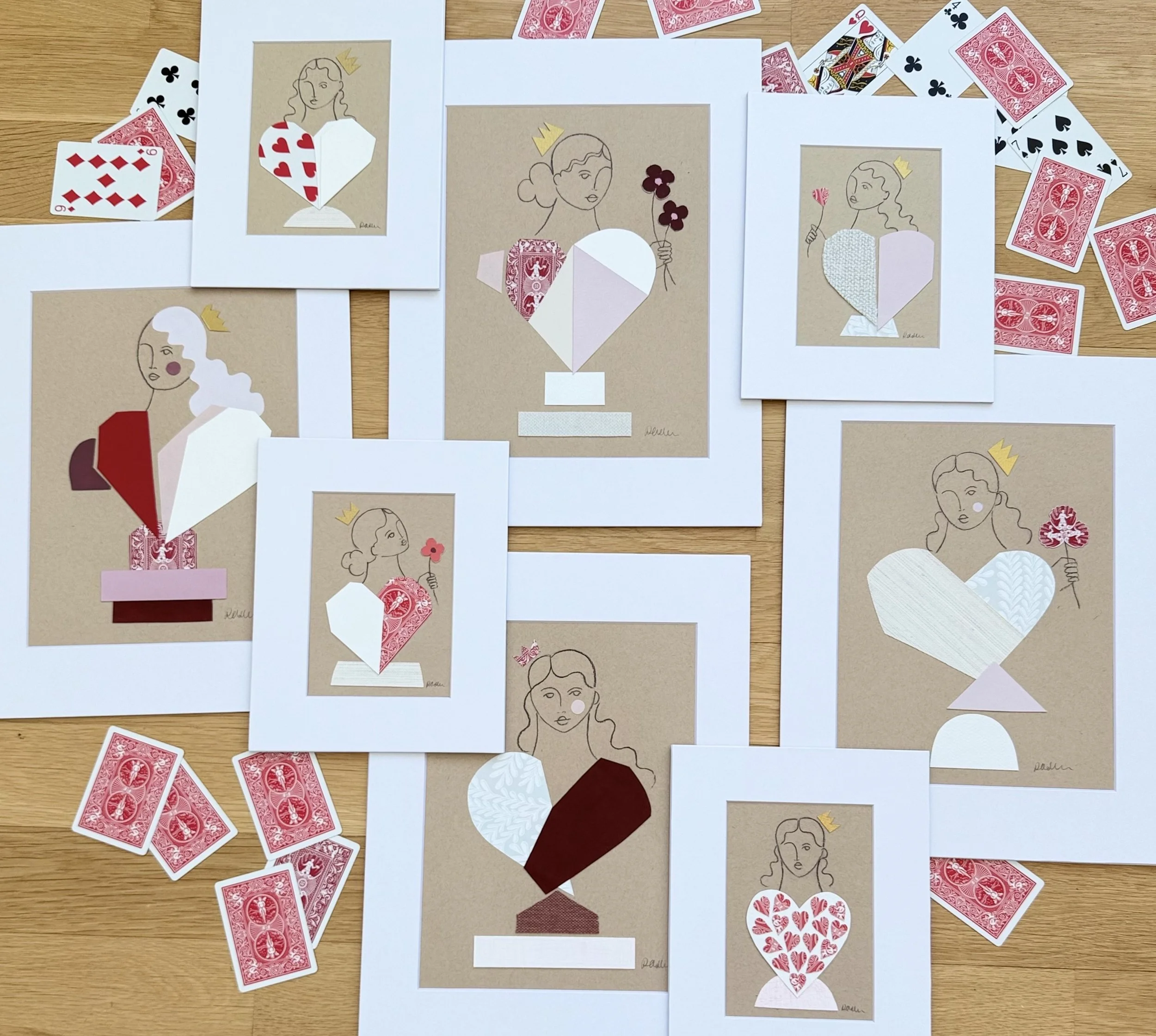 I experimented with them a couple times, looking for a way to riff on the iconic Queen of Hearts—a strong, bold, romantic, emotional figure that, to me, symbolized power and femininity. I created a few collages, but the art wasn’t art-ing and eventually I set them aside. This year, however, something clicked: perfectly imperfect heart-shaped busts, peppered with playing cards.